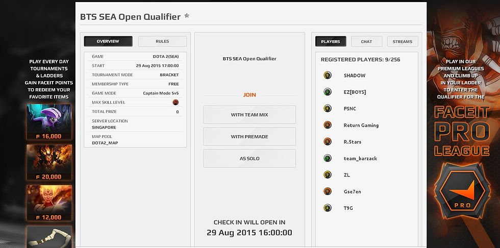 BTS SEA Cup Open qualifier will be using Faceit platform for their tournament. All teams required to register and create their team in Faceit to participate. Faceit platform is the same platform used by The International 4 Open Qualifier in each region.